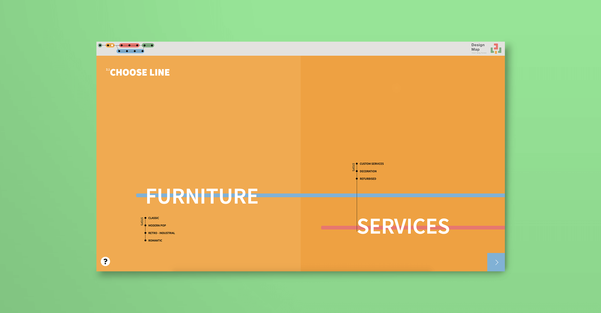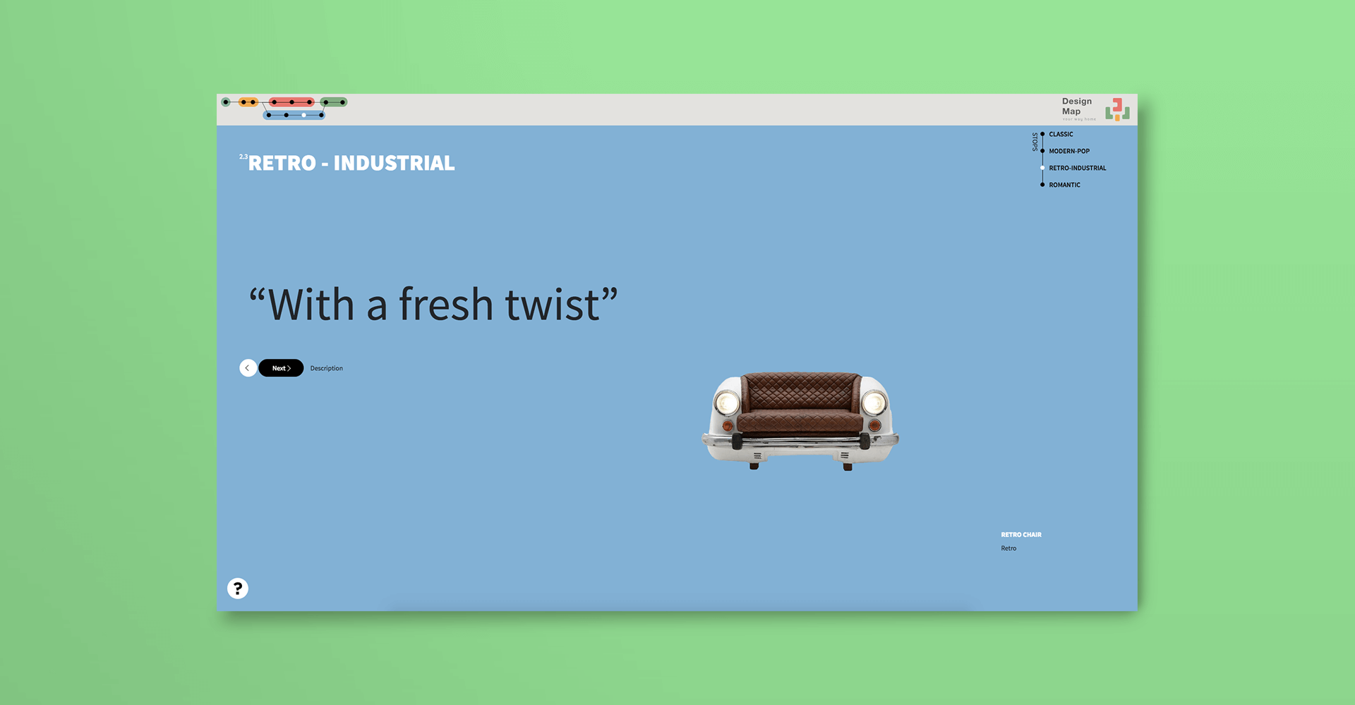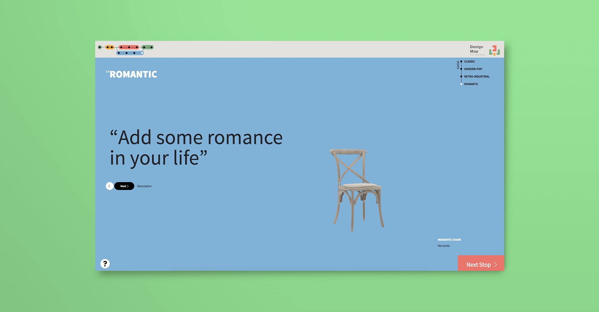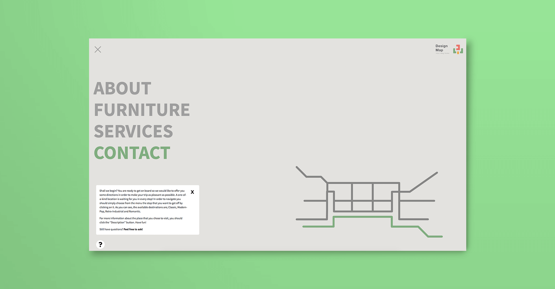 Shall we begin? You are ready to get on board so we would like to offer you some directions in order to make your trip as pleasant as possible. A one-of-a-kind location is waiting for you in every stop! In order to navigate you should simply choose from the menu the stop that you want to get off by clicking on it. As you can see, the available destinations are; Classic, Modern-Pop, Retro-Industrial and Romantic.